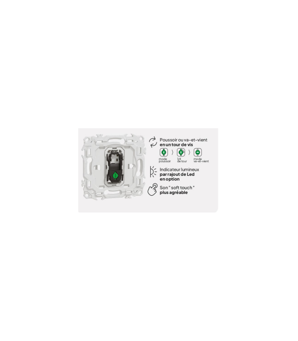 • Commande multifonctionnelle : interrupteur, va-et-vient et poussoir en une seule référence. Poussoir ou va-et-vient ​en un tour de vis !